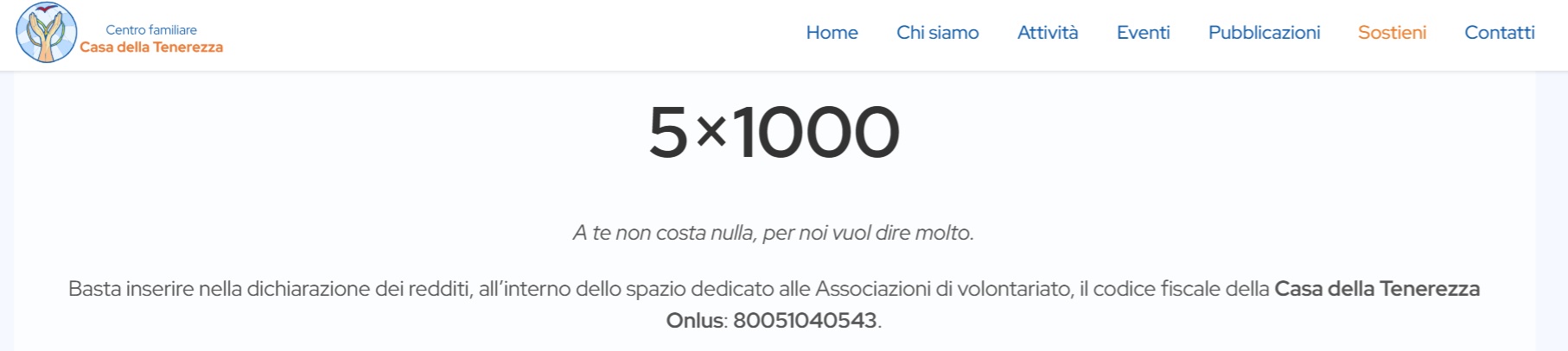 Per chi volesse aiutarci nelle varie attività può indicare la nostra associazione per la destinazione del 5 x mille, mentre chi volesse darci un contributo economico diretto, può andare sul sito, nella sezione sostieni https://www.casadellatenerezza.it/sostieni/ e seguire le modalità e le indicazioni presenti. GRAZIE a tutti!